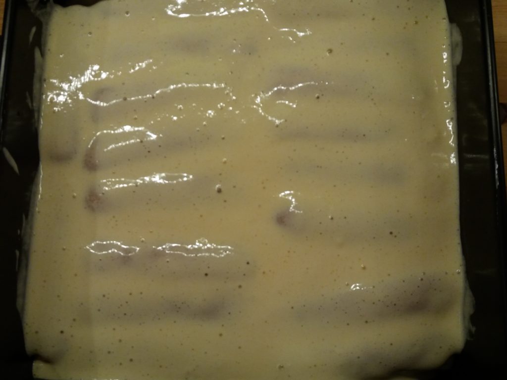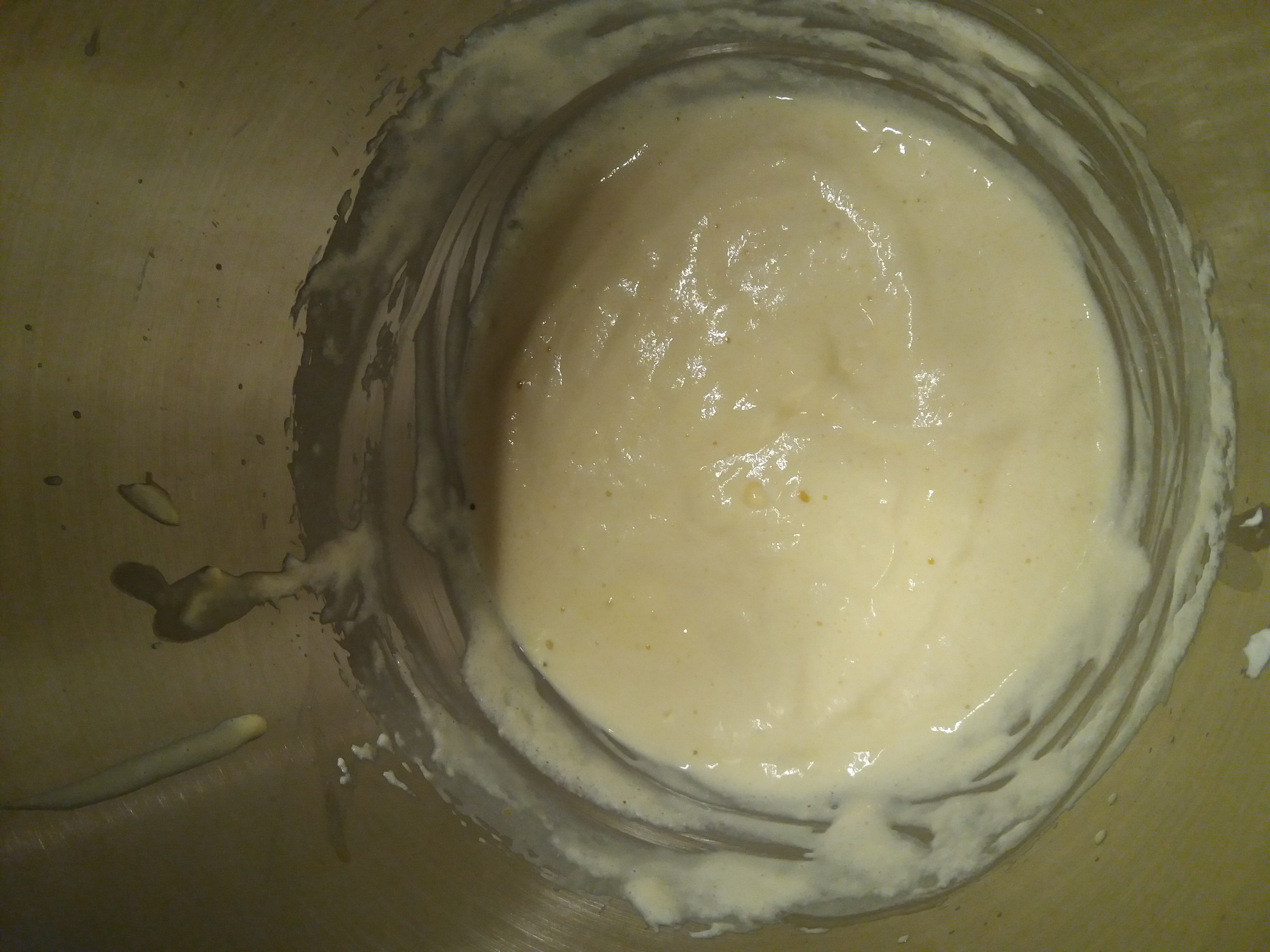 Dan heb ik het mascarponemengsel gemaakt. 250g mascarpone, 3el suiker en 3 eidooiers gaan de Kenwood in. Nadat ik de opgeklopte eiwitten onder het mascarponemengsel heb gespateld, ziet het er zo uit :